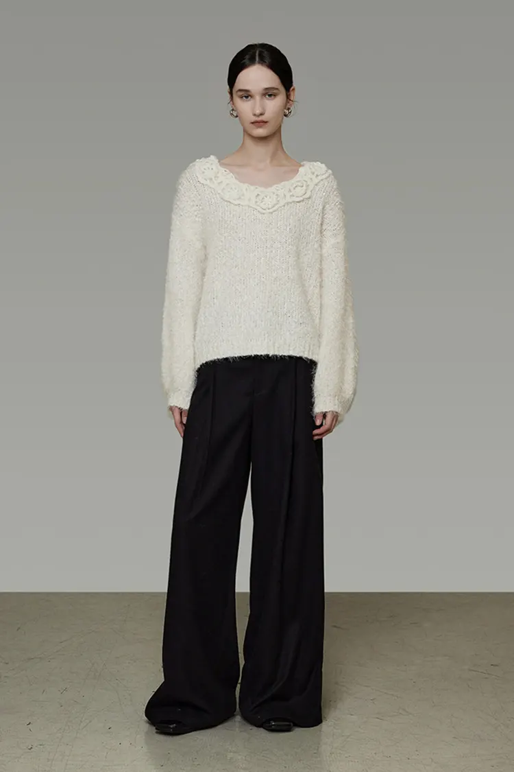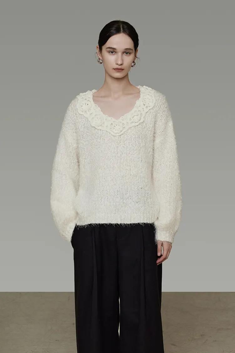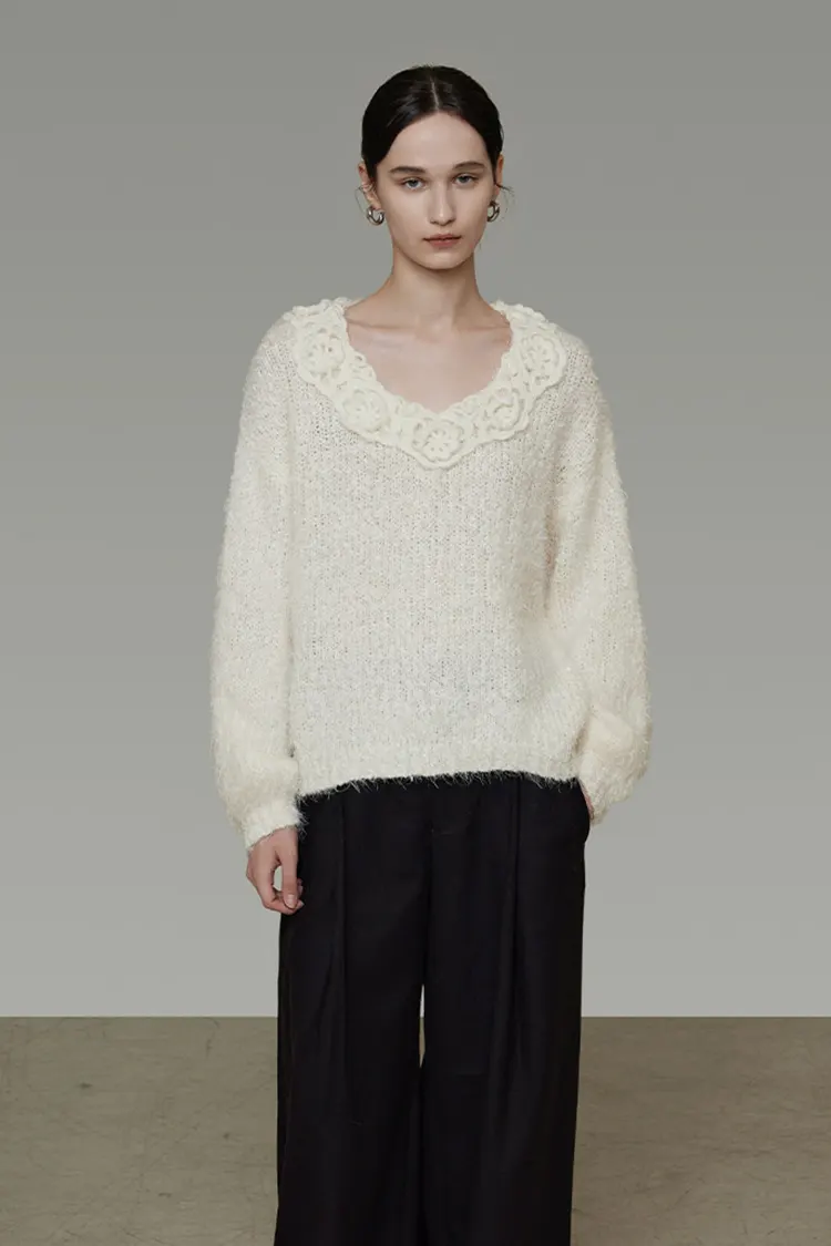 Il maglione in pizzo 3D da donna presenta un design con profondo scollo a V. Il bordo dello scollo è ornato da pregiati pizzi traforati ricamati, completati da piccoli bottoni in tessuto dello stesso tessuto. La lavorazione del pizzo tridimensionale è chiaramente stratificata, con dettagli delicati e morbidi. L'aspetto generale è dolce, romantico e tuttavia elegante. Sia visto di fronte che da dietro, possiede un forte senso del design, consentendo al semplice maglione in tinta unita di staccarsi dalla monotonia e di migliorare senza sforzo la raffinatezza dell'outfit. È particolarmente adatto ai consumatori che apprezzano i dettagli e la consistenza.
