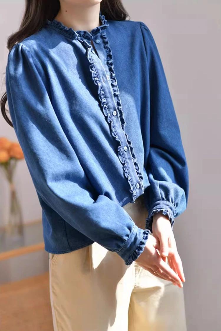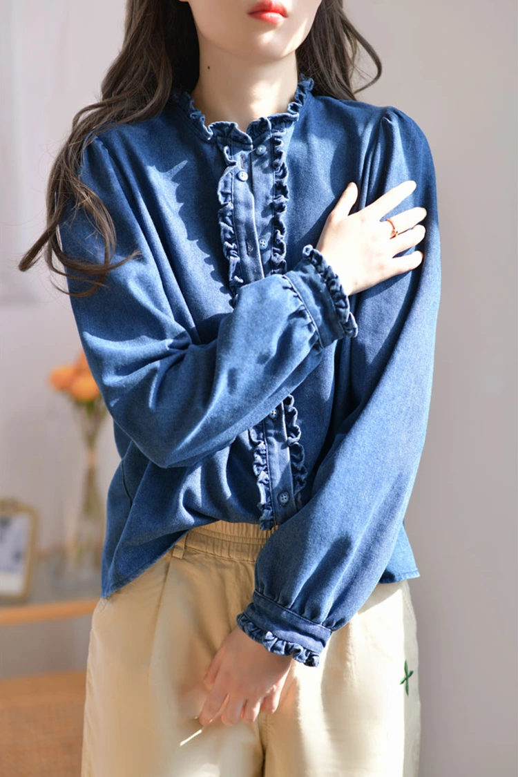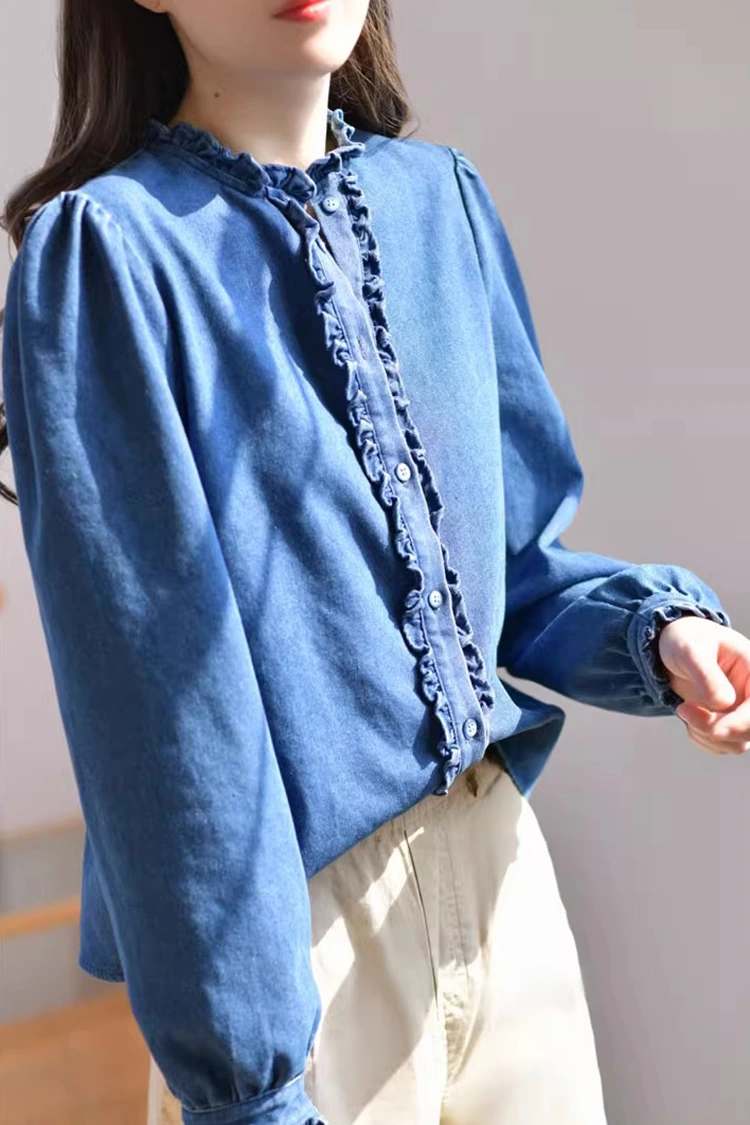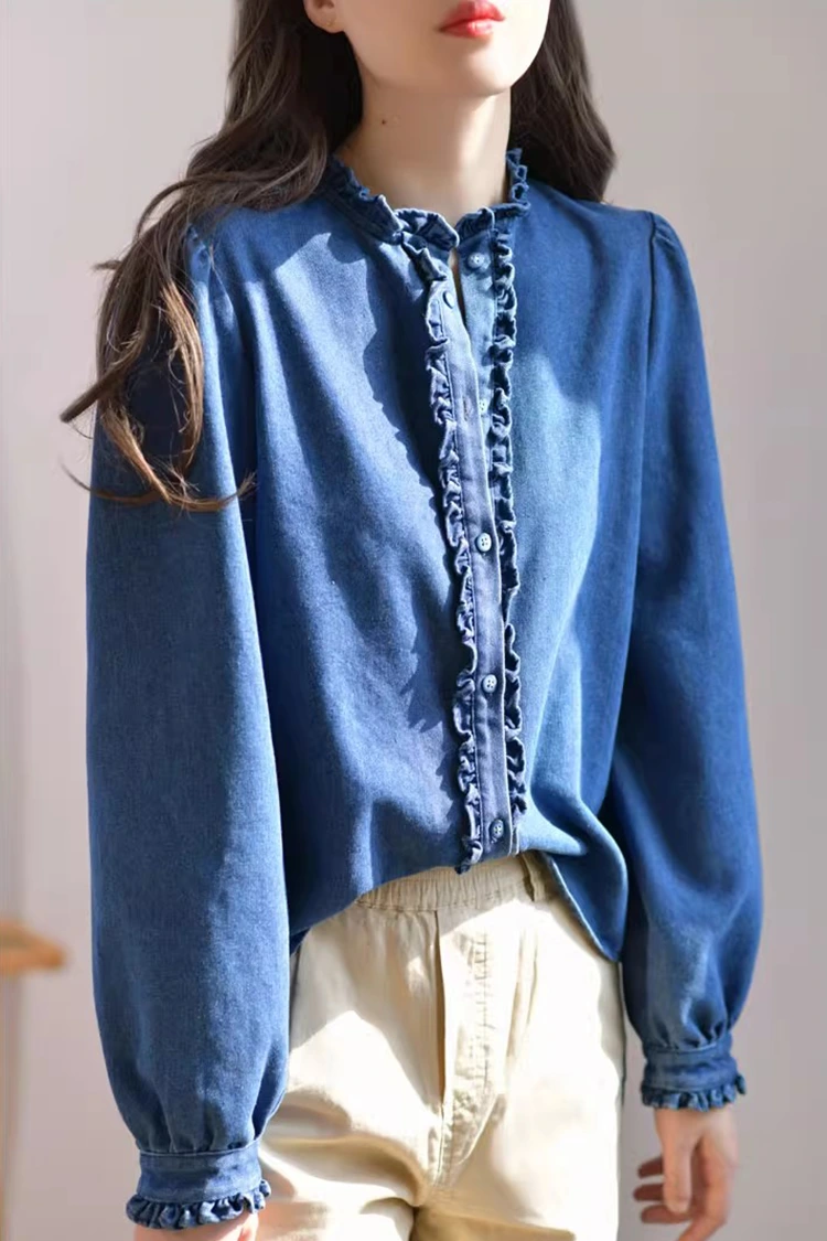 La camicetta casual in denim da donna adotta un design retrò e casual, che si adatta perfettamente alla forma del corpo femminile. Non dipende dal tipo di corporatura e non solo può affinare le linee delle spalle e del collo, ma anche nascondere il grasso in eccesso sulla vita e sull'addome. Soddisfa le esigenze di diversi tipi di corporatura. Il colletto è progettato come un colletto rialzato, abbinato a squisiti bordi arricciati. Anche l'apertura frontale e i polsini sono decorati con delicati bordi arricciati. Abbinato alle morbide maniche lunghe a forma di lanterna, unisce perfettamente l'eleganza retrò e la disinvoltura casual. Il semplice motivo in tinta unita è classico e resistente e non passerà di moda. Può creare un look casual quotidiano o un semplice stile business ed è molto pratico.